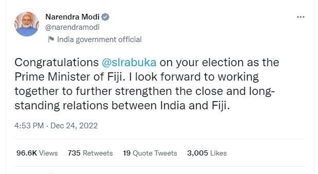 पीएम मोदी ने ट्वीट किया, फिजी के प्रधानमंत्री के रूप में आपके चुनाव पर आपको बधाई. मैं भारत और फिजी के बीच घनिष्ठ और लंबे समय से चले आ रहे संबंधों को और मजबूत करने के लिए मिलकर काम करने का उत्सुक हूं.’