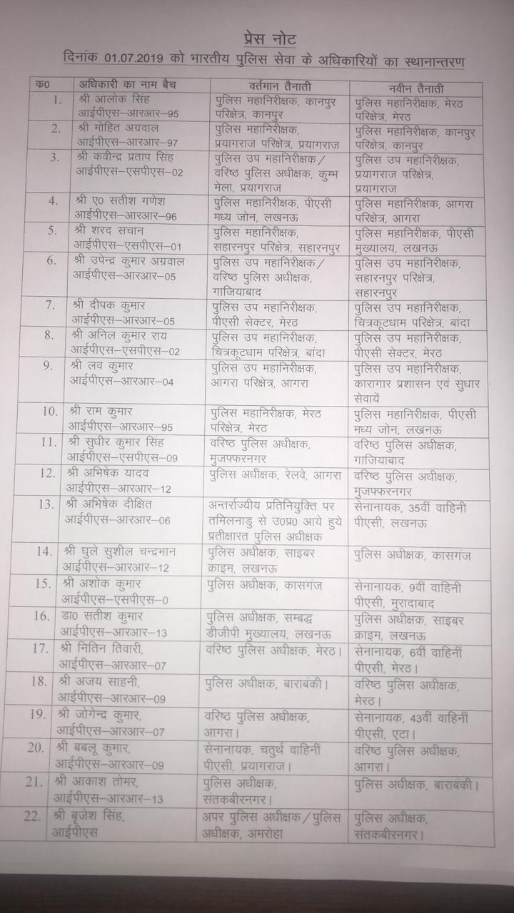 पीएसी मध्य जोन के आईजी ए सतीश गणेश को आगरा का नया आईजी रेंज बनाया गया है. यहां तैनात लव कुमार को कारागार विभाग में डीआईजी के पद पर तैनाती दी गई है. मेरठ में मॉब लिंचिंग को लेकर हुए विरोध प्रदर्शन के दौरान बवाल की गाज आईजी और एसएसपी पर गिरी है. आईजी राम कुमार के साथ साथ एसएसपी नितिन तिवारी को भी हटा दिया गया है. बाराबंकी के एसपी अजय साहनी को मेरठ का नया एसएसपी बनाया गया है.